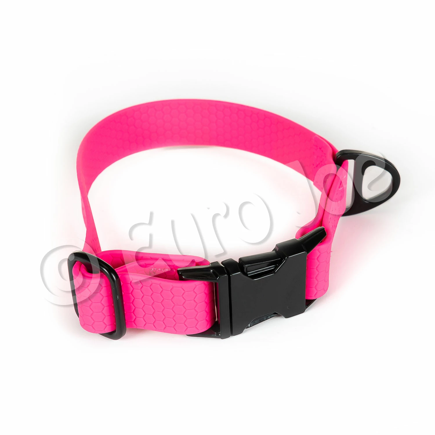This collar is made of waterproof strap. The strap has a honeycomb pattern (hexagonal) on both sides and has a PVC / TPU coating.