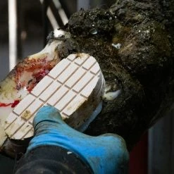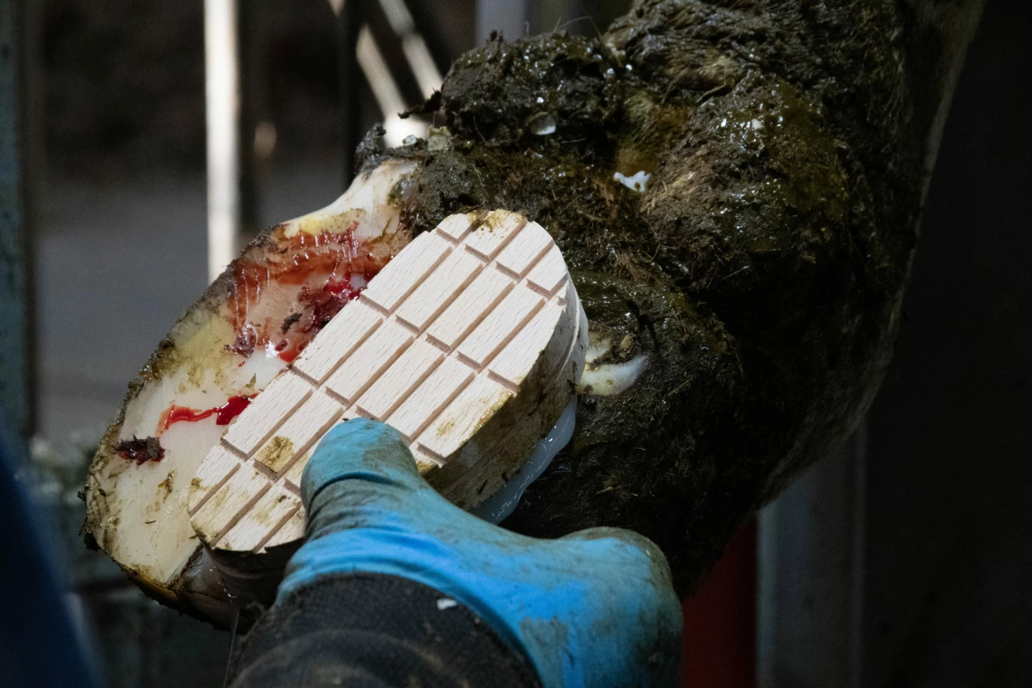Beukenhouten klosjes om onder de gezonde klauwen van koeien te plakken.